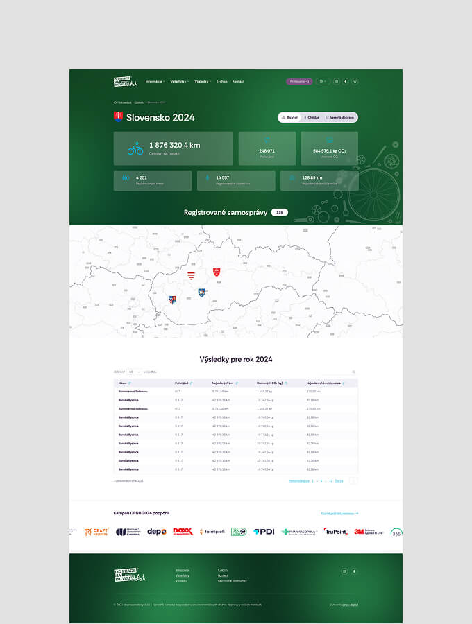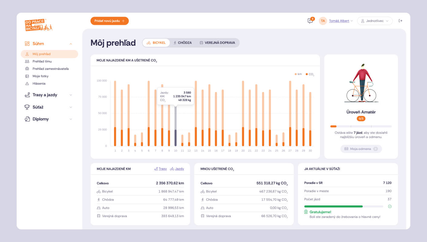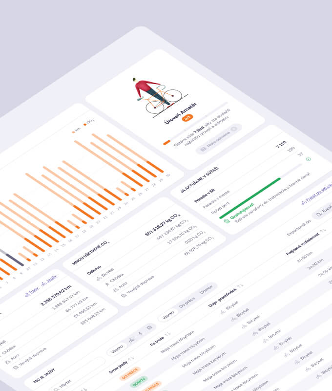 okto—digital navrhlo a vybudovalo digitálny ekosystém, ktorý riadi celú súťaž od začiatku do konca. Systém pokrýva viacero registračných úrovní (VÚC, samospráva, spoločnosť, tím a užívateľ), spravuje užívateľské profily a zaznamenáva denné jazdy a dopravné prostriedky. Každý záznam automaticky prispieva k výpočtom úspory CO₂, k získavaniu gamifikovaných odznakov a započítava sa do rebríčkov.